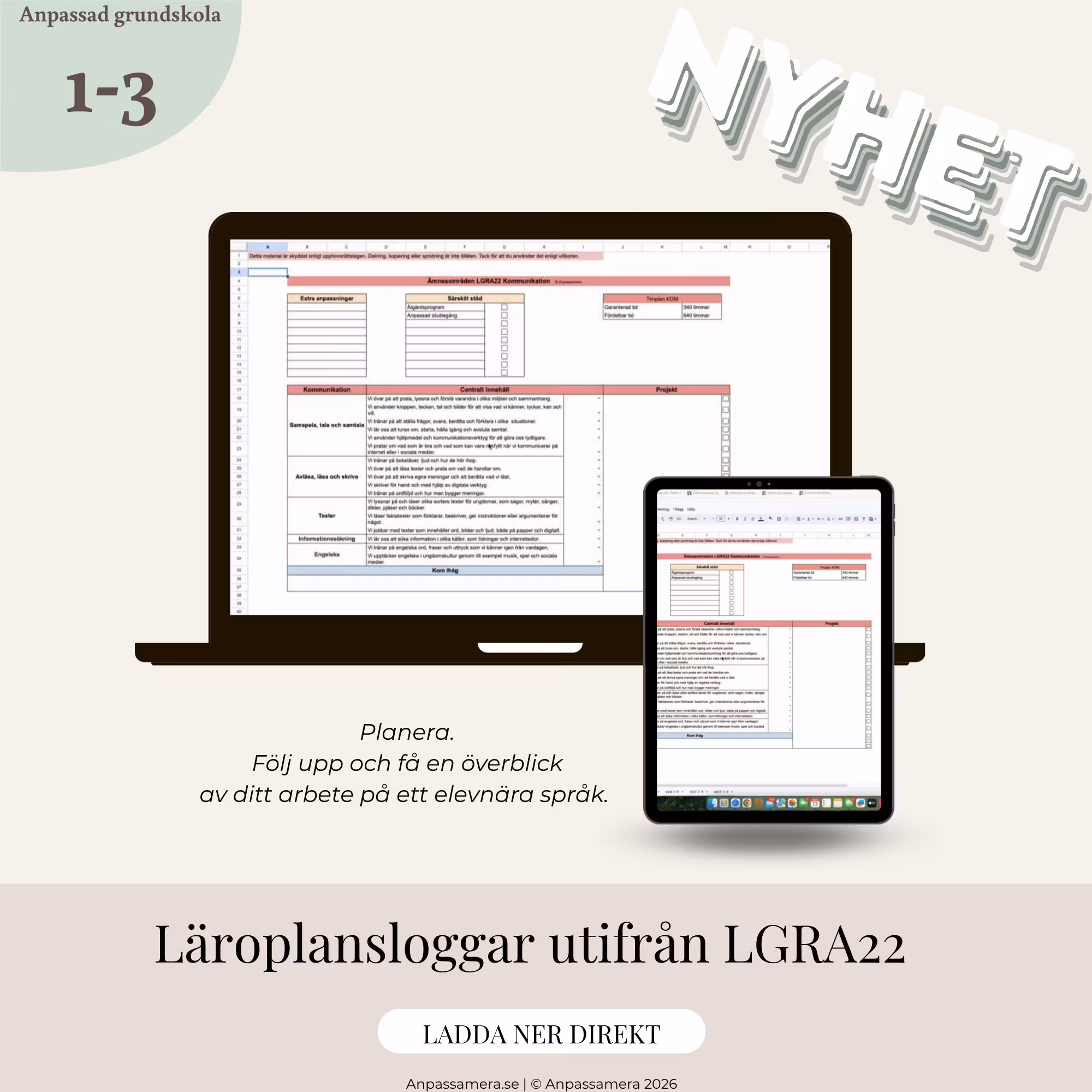 Anpassameras läroplansloggar är framtagna av specialpedagog och speciallärare och bygger på Lgra 22 skapade för att förenkla planeringen för lärare och resurser i anpassad skola.