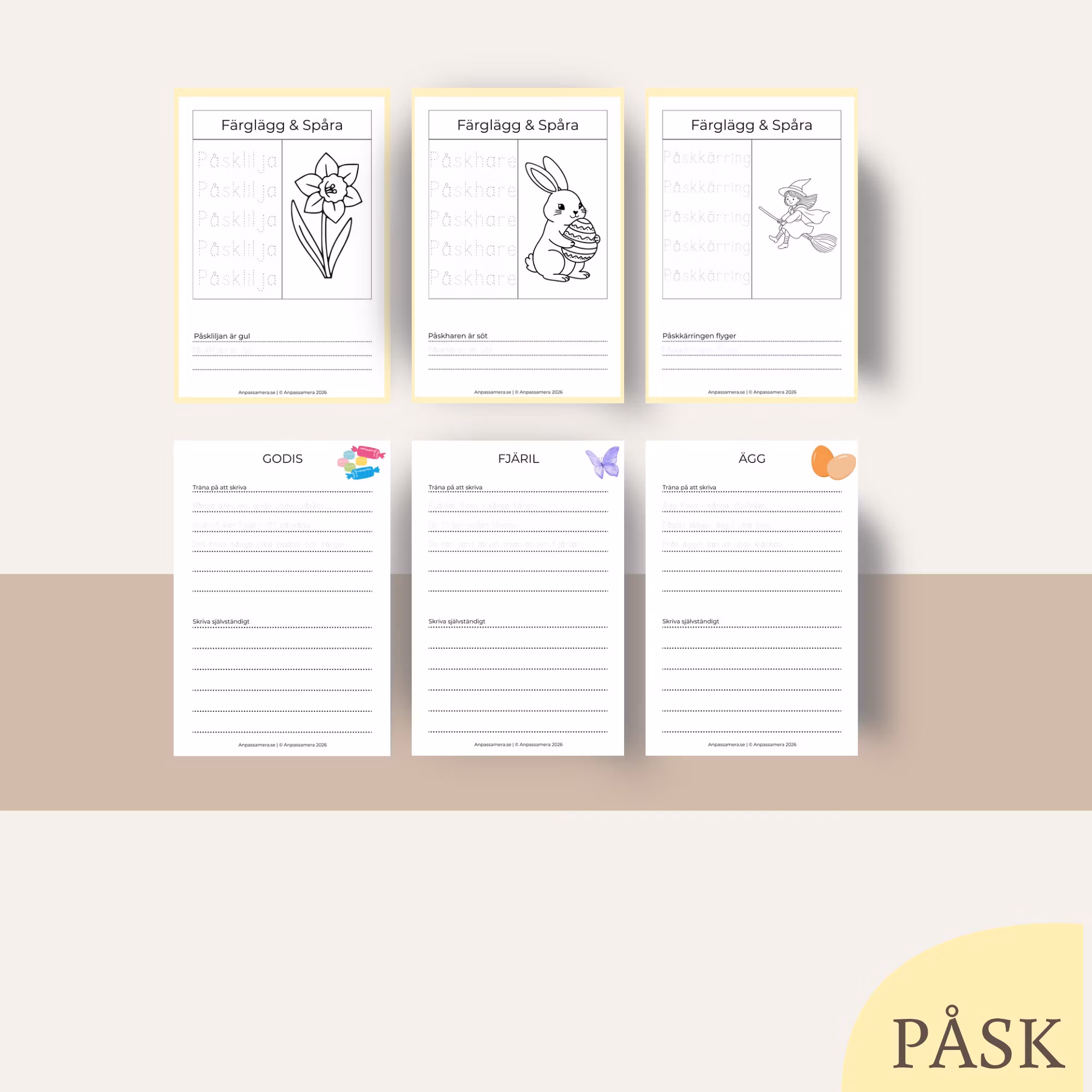 Påsk arbetsblad färdigt material för att träna spåra, färglägga och skriva