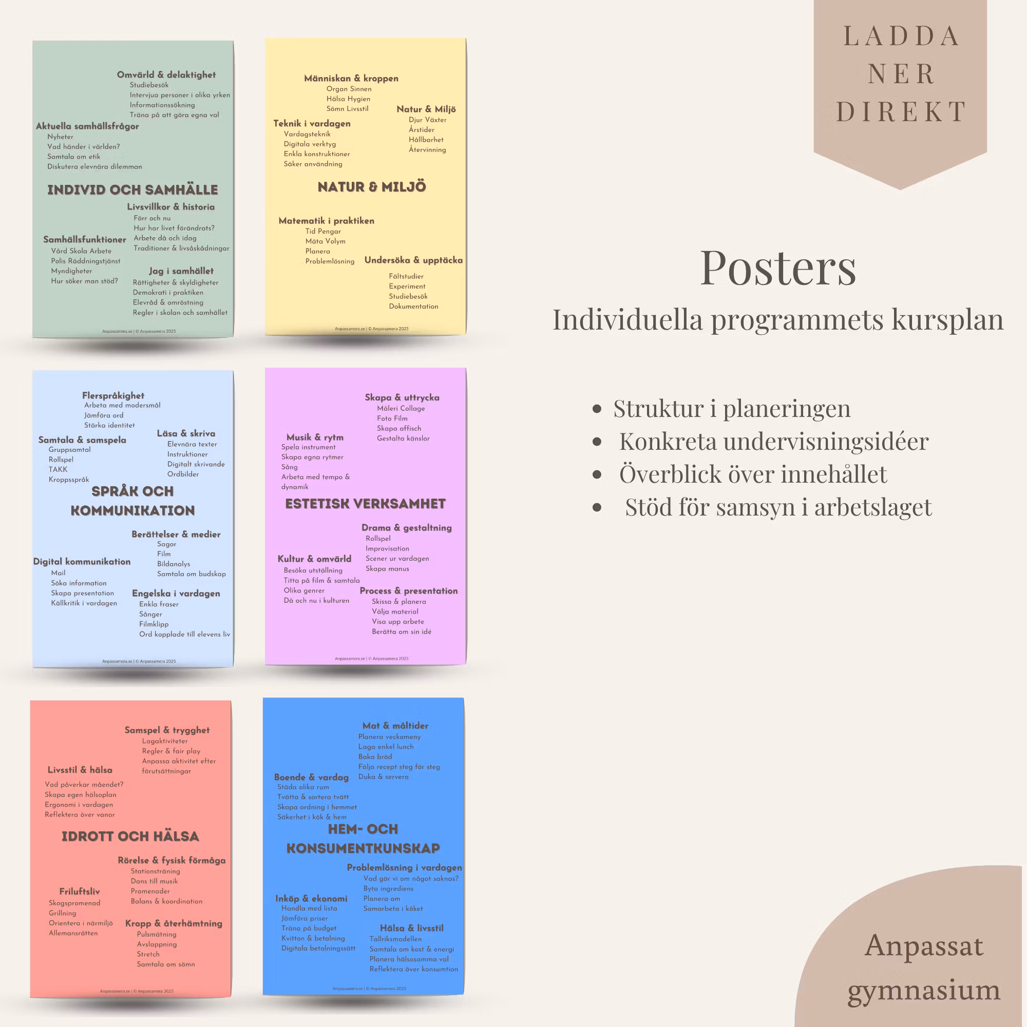 De här posterserna konkretiserar innehållet i undervisningen och gör det enkelt att planera, variera och följa en röd tråd. Du ser snabbt vad ni kan arbeta med och får ett stöd som fungerar i vardagen.
